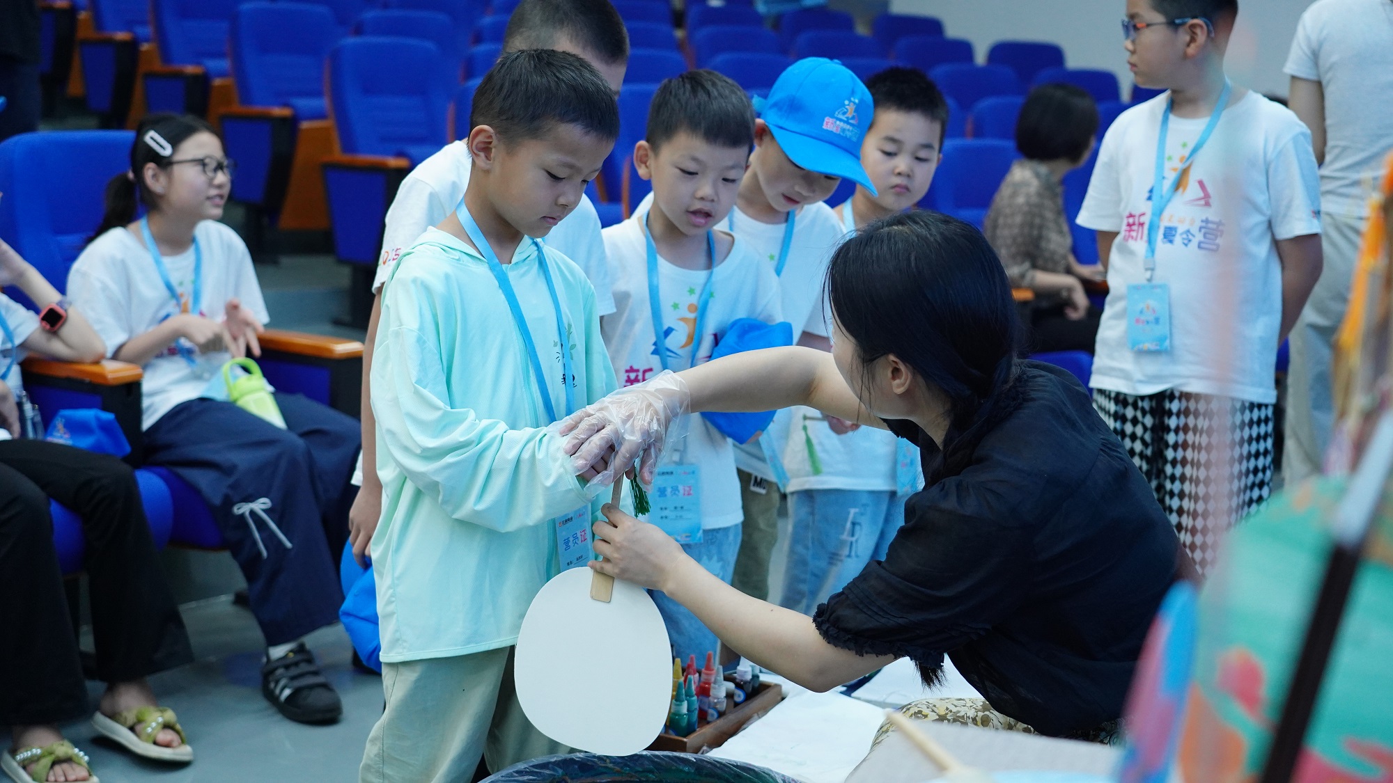 在老師的指導(dǎo)下,孩子們認(rèn)真學(xué)習(xí)漆扇制作技巧,從顏色選擇到滴入漆料再到素扇入水附著花紋,一把把絢麗、雅致的漆扇躍然而出。大家在實(shí)踐中感受非遺技藝的精妙,更在潛移默化中培養(yǎng)了對(duì)傳統(tǒng)文化的熱愛(ài)。